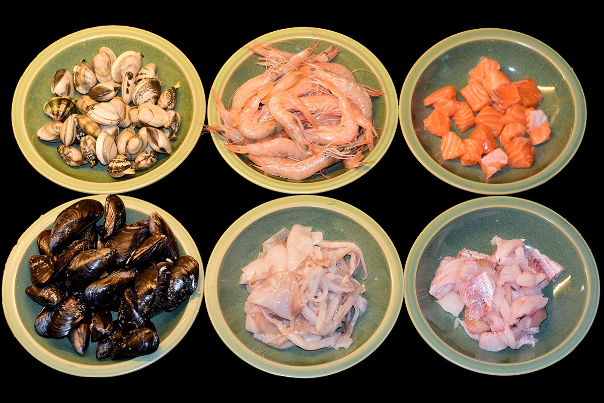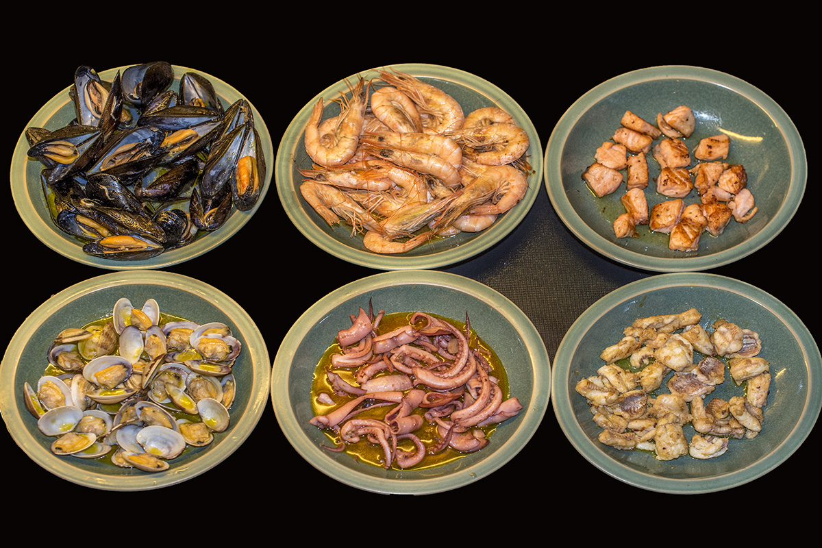 Cosa abbiamo rimediato? Vongole veraci, gamberi, cozze, salmone, totanetti e palombo. I primi tre saranno cotti così come li vediamo mentre il secondo terzetto è stato spinato e pulito.