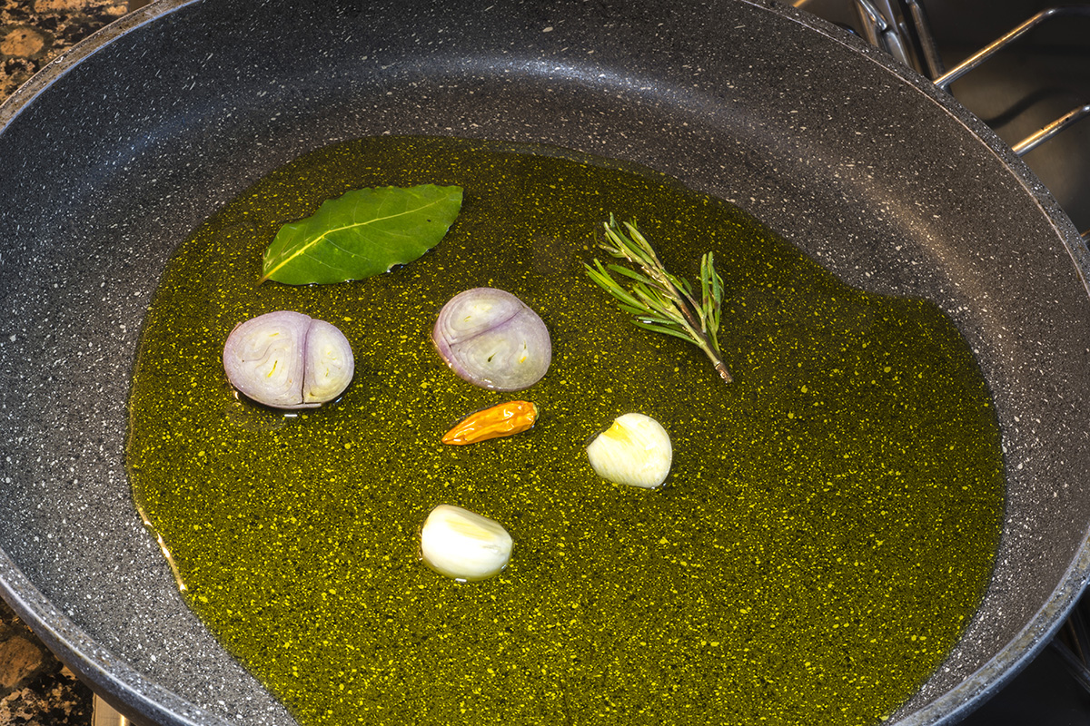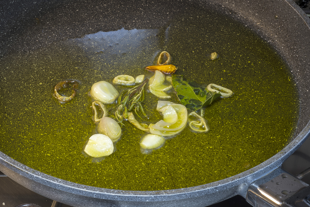 … meditato!… aggiungiamo anche un rametto di rosmarino ed un peperoncino e facciamo andare in olio evo!