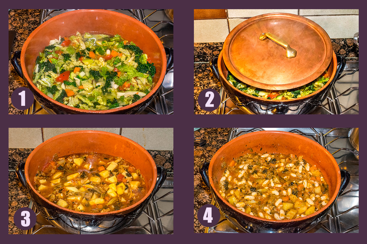 Le patate saranno aggiunte dopo un’ora altrimenti si spappolano (3). I fagioli, già cotti, converrà incorporarli a metà o a fine cottura come nel nostro caso (4)…