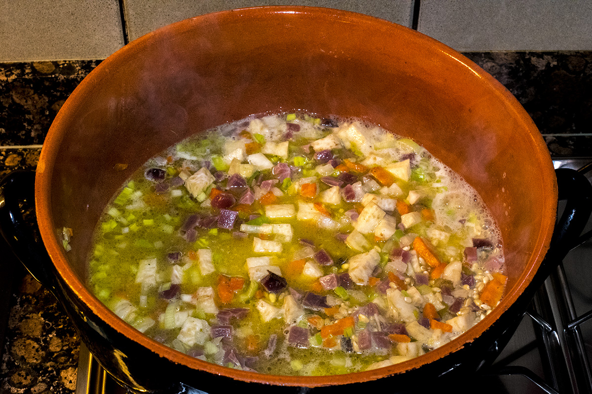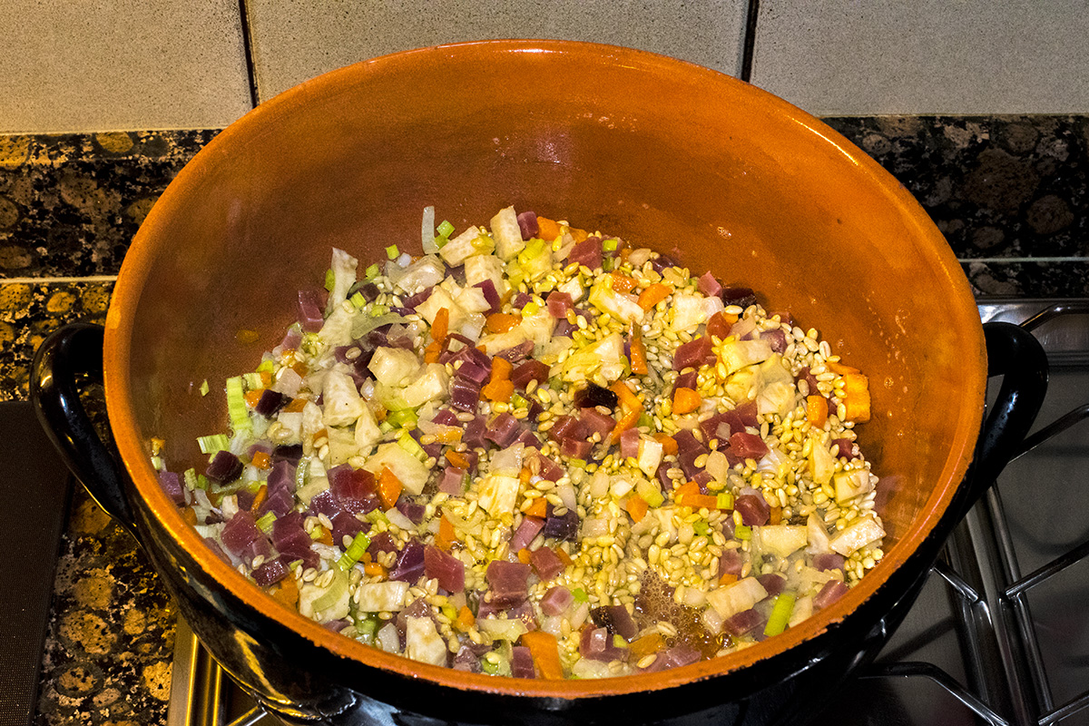 Aggiunta anche dell’orzo perlato e tostatura del tutto in burro o, meglio, burro e olio.