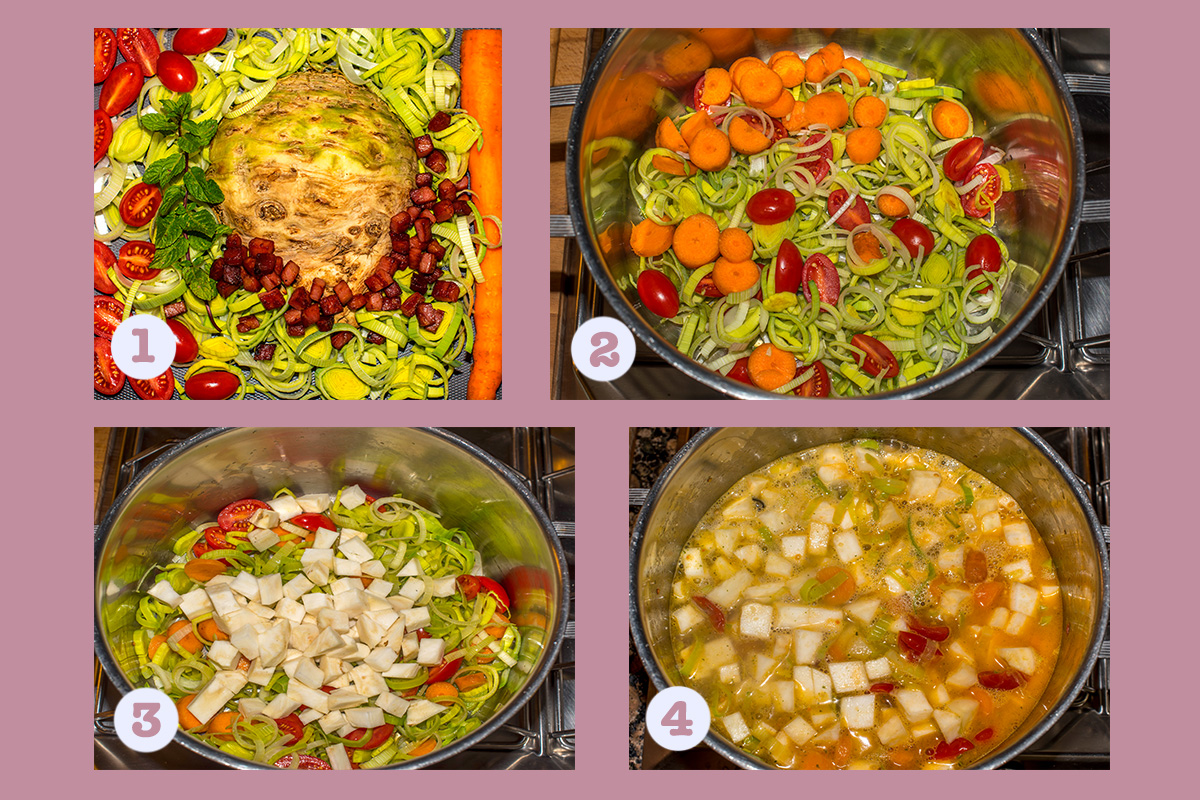 Nella fig. 1 vediamo gli ingredienti compresi i dadini di speck già tostati in padella senza olio e la menta che farà la sua comparsa come guarnizione. Nella successiva(2) si fanno andare porro, carota e pochi datterini in due corpi grassi. Nella fig. 3 inizia l’aggiunta dei dadi di sedano rapa che è stato pulito come una patata anche se la scorza è, evidentemente, più spessa e dura. Nell’ultimo riquadro(4) è iniziata l’aggiunta del brodo vegetale che accompagnerà la cottura per l’ora successiva.