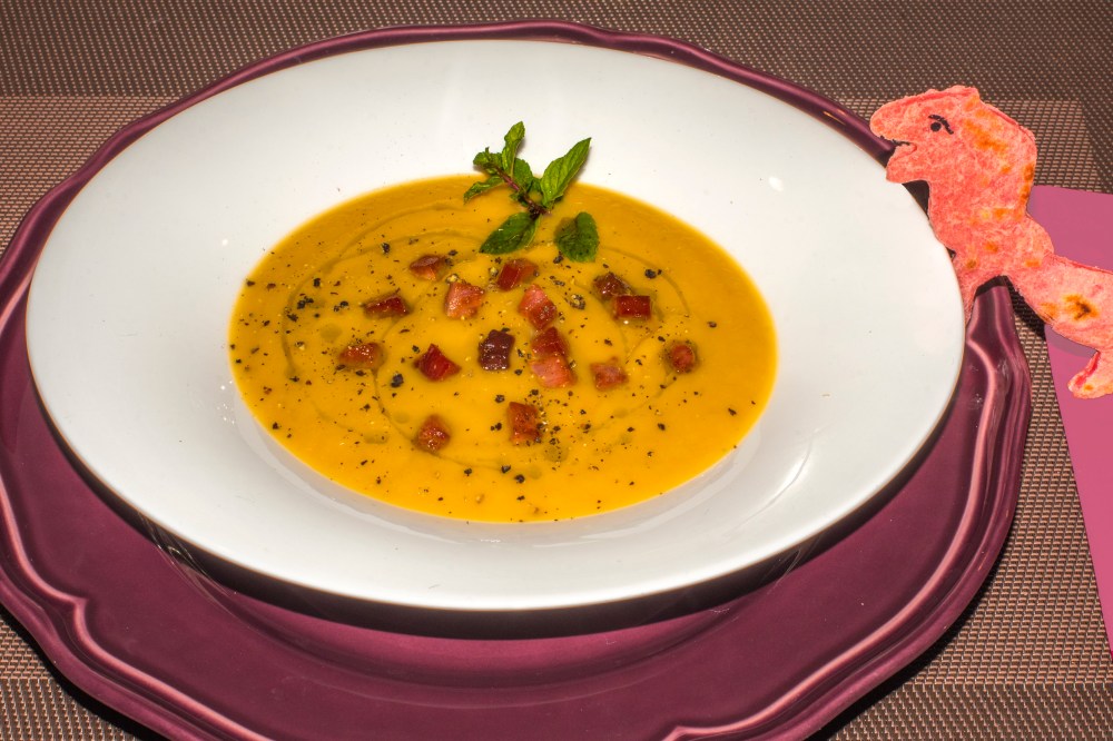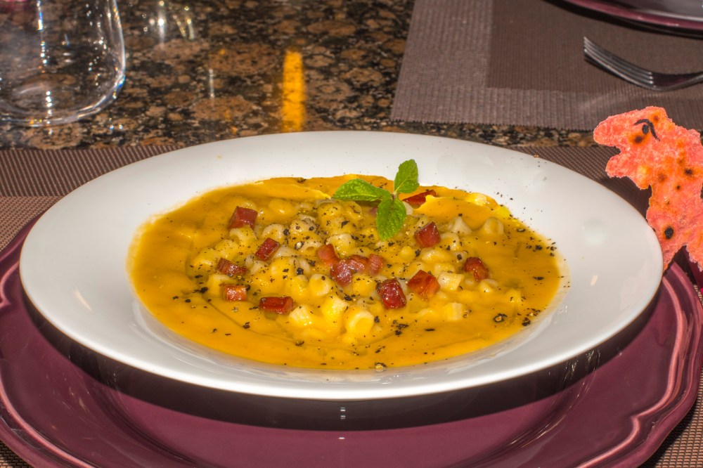 Componiamo il piatto con i dadini di speck, un giro d’olio evo, una grattugiata di pepe nero, un rametto di menta e…