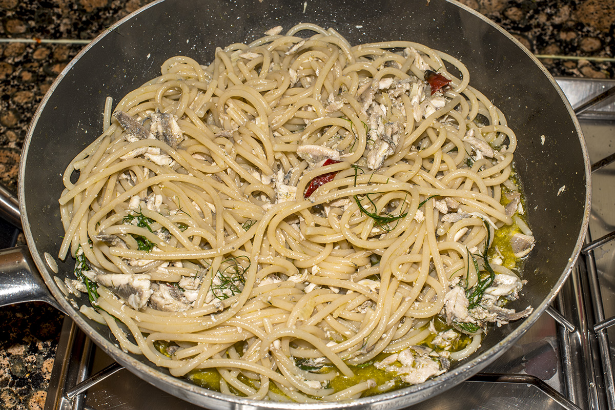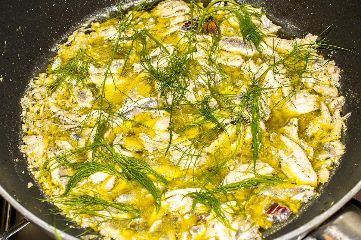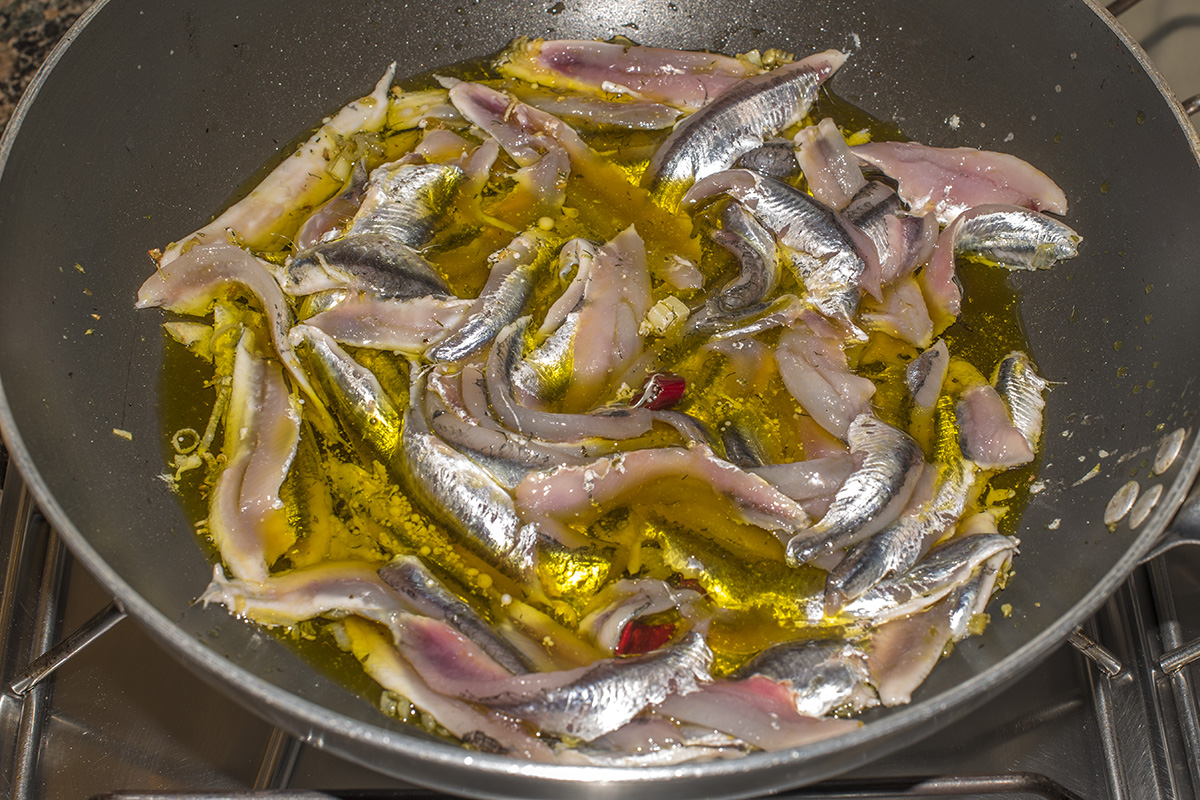 … e si tufferanno le alici. Seguirà a breve il finocchietto selvatico perché la cottura richiederà pochi minuti…