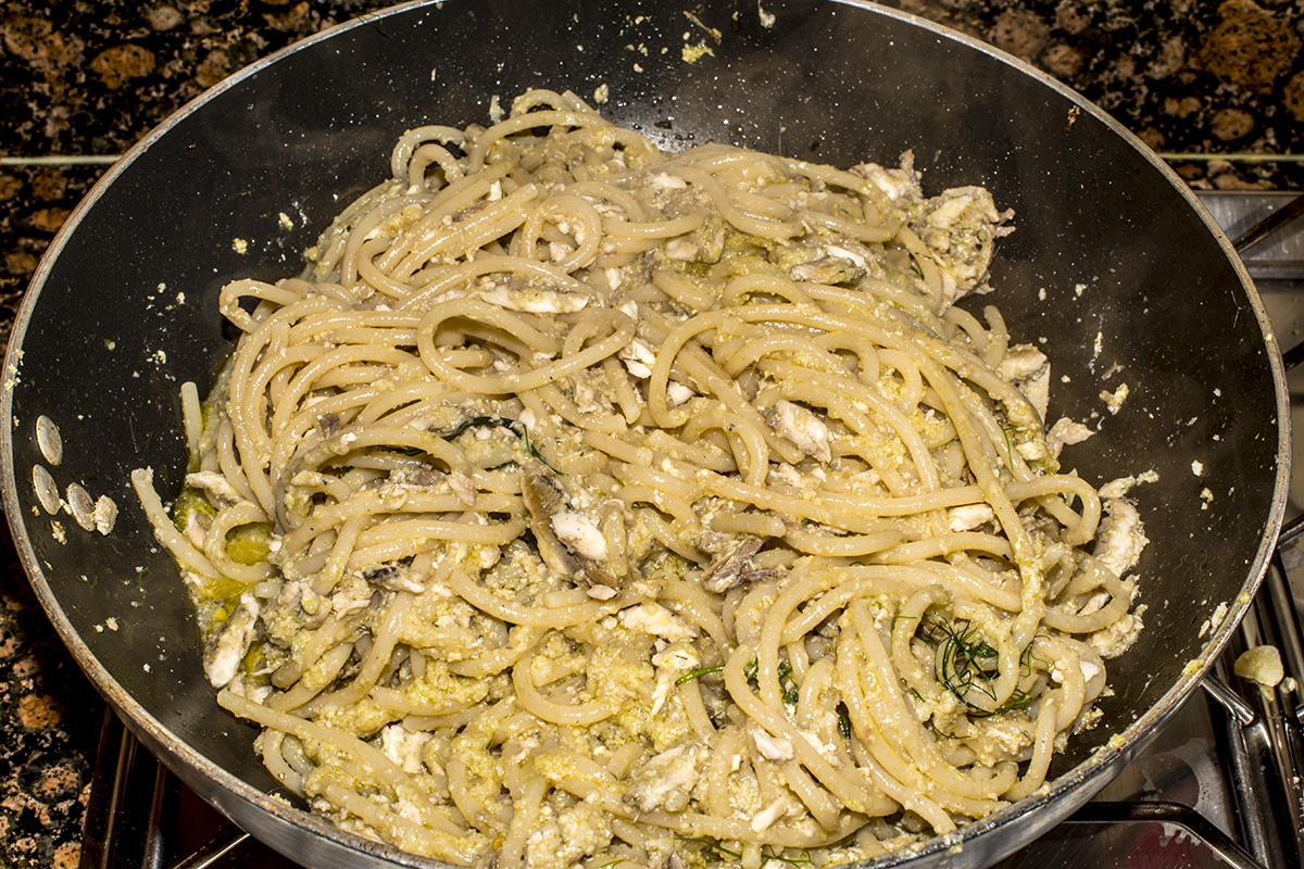 Ed eccoli scolati al dente nel condimento. Non serve mantecatura ma solo mescolamento con l’eventuale aggiunta di piccole quantità di acqua di cottura perché questa pasta cede poco amido ed ha, quindi, una bassa tendenza a seccare, anzi…