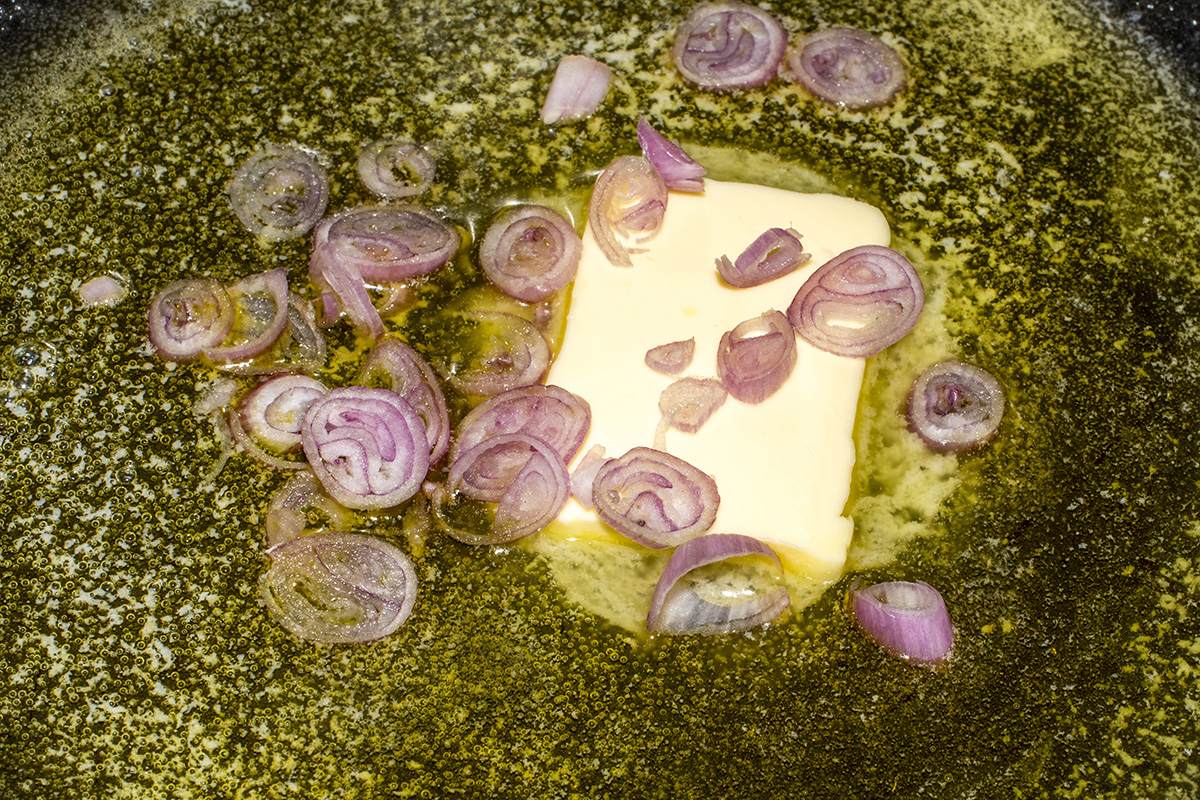 Let’s start with some shallots in salted butter and extra-virgin olive oil…