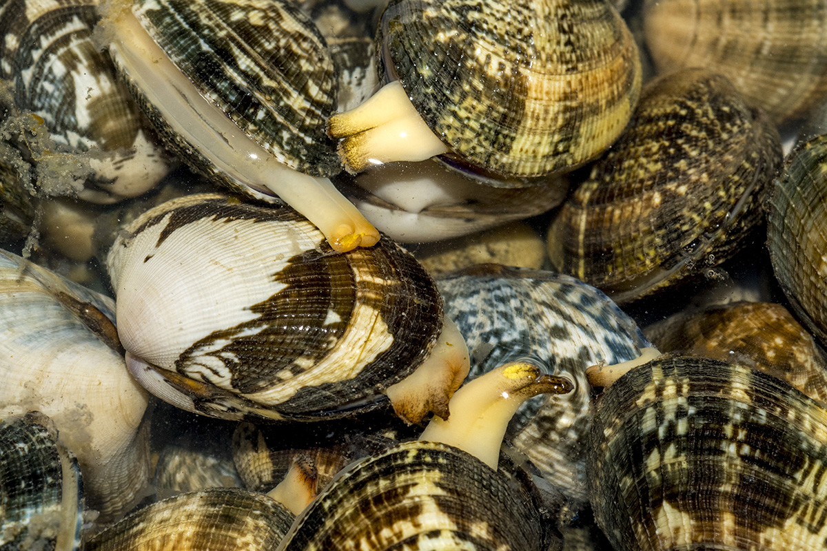Il primo passo per la realizzazione della ricetta è, al solito, la materia prima. Su molte etichette di molluschi potete leggere “il prodotto deve essere venduto vivente e vitale”. Non è sufficiente che sia vivo ma lo vogliamo anche vispo… magari come questa vongola che fa avances con un “vongolo” un po’ timido…