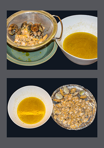 Intanto la temperatura delle valve ha raggiunto livelli accettabili dai nostri polpastrelli e possiamo procedere alla separazione dei molluschi dalle dimore… una specie di sfratto… magari in quelli giudiziari sono così gentili da sfrattarti da vivo… Naturalmente conserveremo il liquido residuo alla cottura dei molluschi…