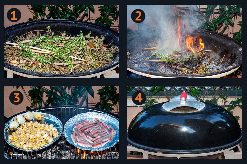 … dovremo studiare una breve affumicatura casalinga che sia percepibile all’esterno del cibo, che dia la prima pungente sensazione olfattiva di legna bruciata per poi liberare gli aromi propri… delle vongole veraci, nel nostro caso.