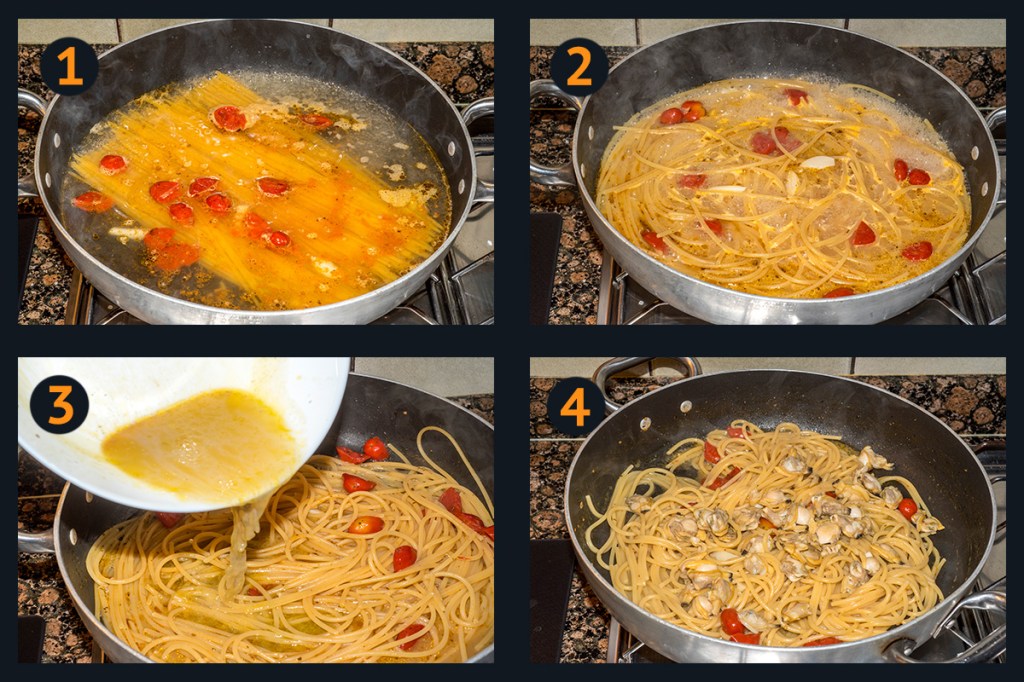 Completiamo la cottura fino ad ottenere un prodotto “al dente” ed aggiungiamo le vongole affumicate… ma non tutte…