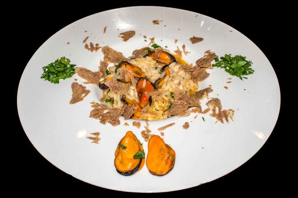 Le cozze sono state aperte in aglio e peperoncino e sgusciate ma la loro acqua di cottura è stata buttata perché il sapore acre e salmastro mal si accorda con quello del nostro tartufo…