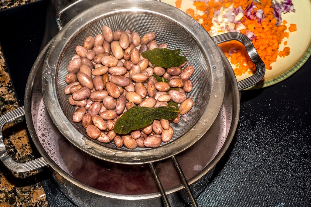 Cuociamo e scoliamo, come al solito, i borlotti in acqua poco salata con qualche foglia di salvia…