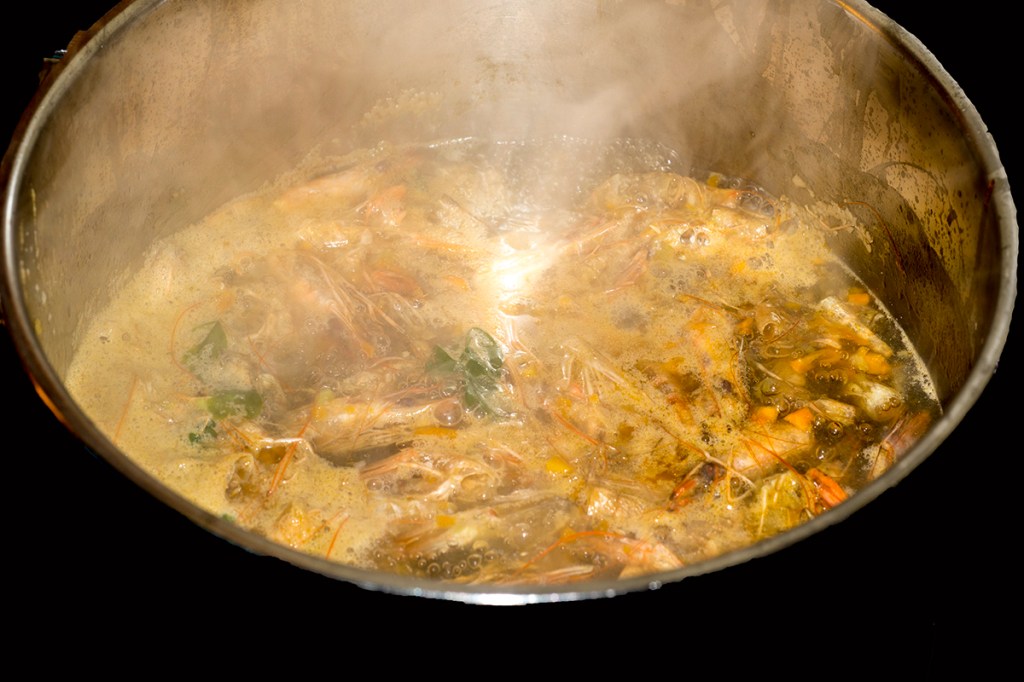 Continueremo la risottatura con la periodica aggiunta di fumetto di gamberi… … e vedremo la pasta divenire cremosa.