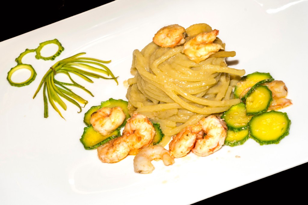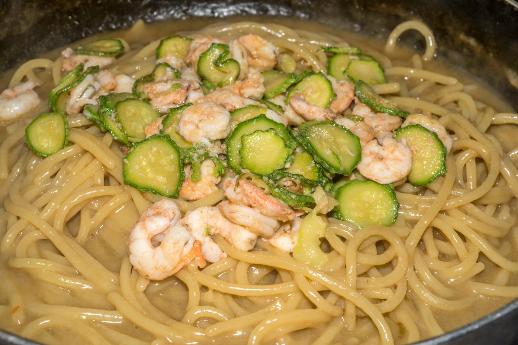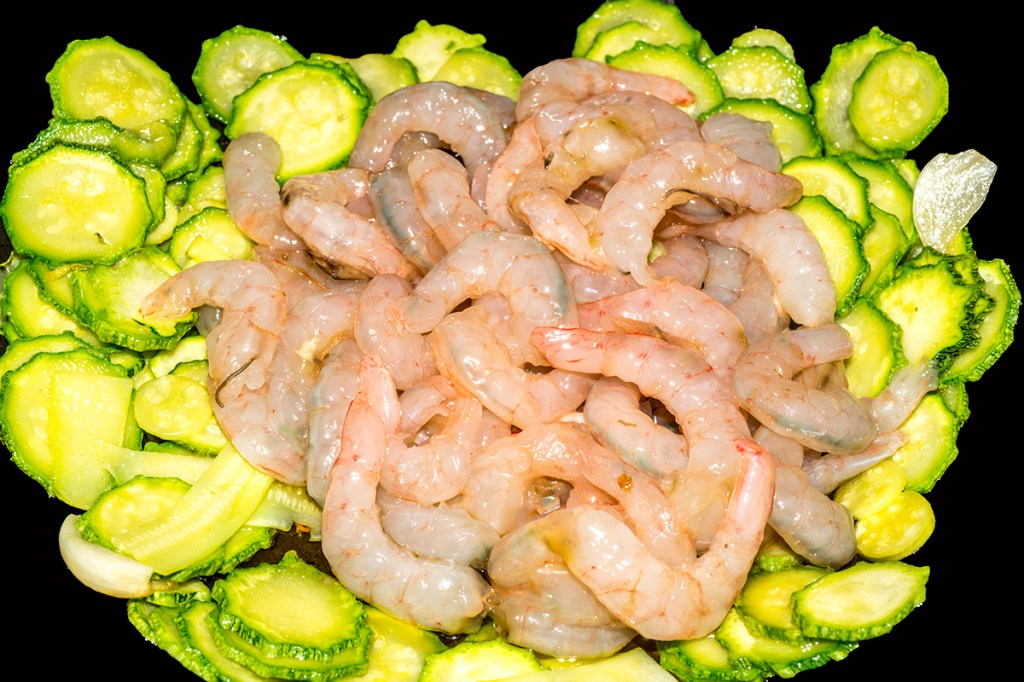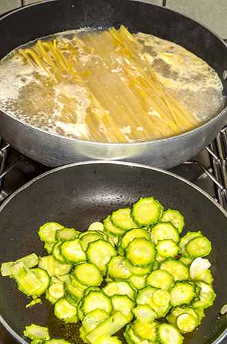 Potremo, quindi, iniziare la “risottatura degli spaghettoni… … “tirandoli” con il brodo di gamberi che avevamo preparato. Contemporaneamente inizieremo la breve cottura di zucchine e gamberi in olio evo e aglio iniziando con le prime che richiedono qualche minuto di più…