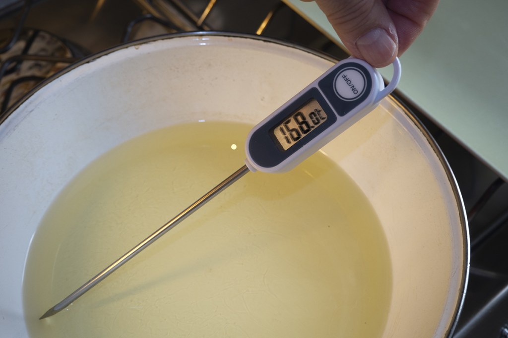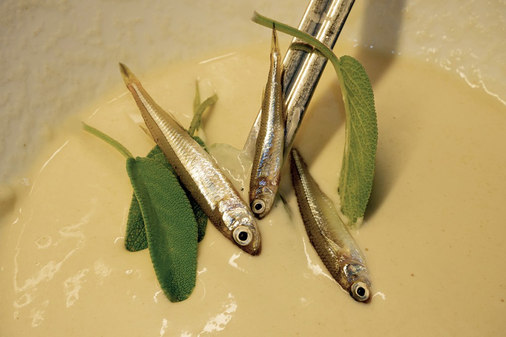Pesci e salvia li abbiamo, la pastella pure, l’olio di semi con una piccola aggiunta di olio evo aromatizzante a 168 °C anche, cominciamo la frittura…
